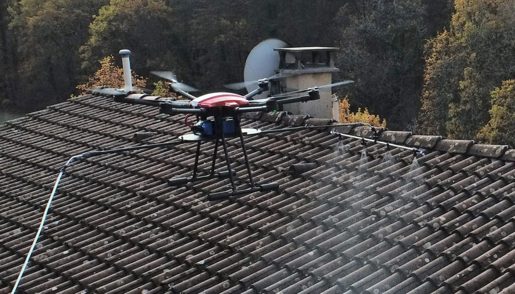 L'intervention avec un (autre) drone pour une action de démoussage et de protection.
